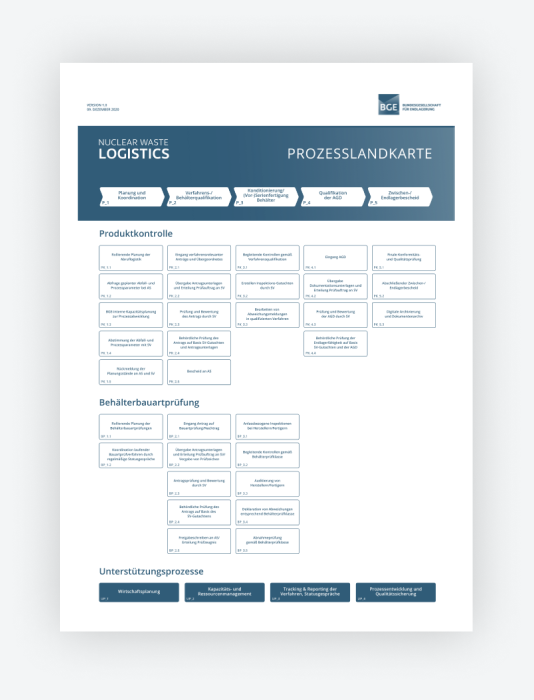 Im Dezember 2020 fiel der Startschuss für eine umfassende Digitalisierung der Produktkontrolle radioaktiver Abfälle. Zu Beginn des Projektes wurde die interne und organisationsübergreifende Prozesseffizienz der Produktkontrolle und Behälterbauartprüfung analysiert, modelliert und für eine digitale Unterstützung optimiert. Über den gesamten Produktkontrollprozess wurden 75 Touch Points zwischen allen Beteiligten identifiziert und Haupt-, Teil- sowie Unterstützungsprozesse definiert.